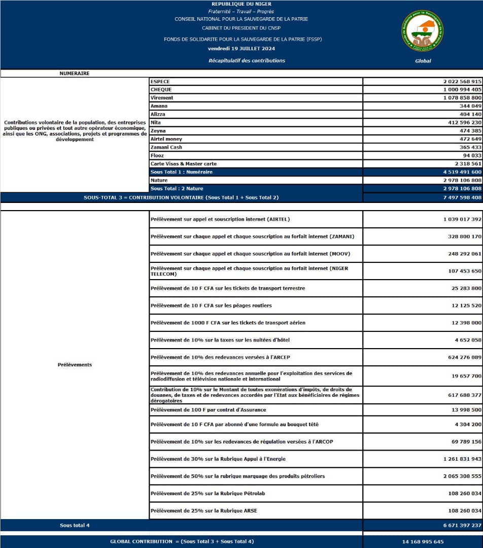 Nous invitons tous les citoyens à consulter le reporting et le récapitulatif des contributions au Fonds de Solidarité pour la Sauvegarde de la Patrie en ligne sur www.fssp.ne , et à continuer à soutenir cette noble cause qui est l’affaire de tous. Ensemble, nous sommes plus forts.